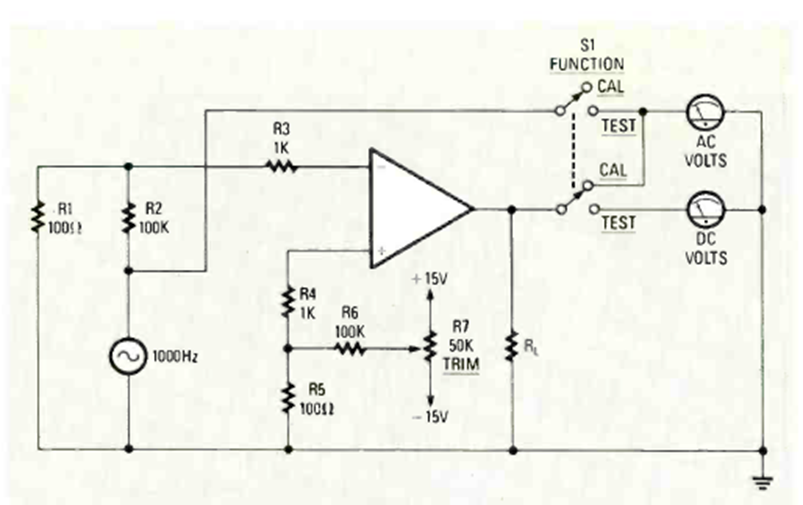 This simple operational amplifier tester was published in the November 1987 issue of Radio Electronics magazine. The power supply must be in accordance with the operational amplifier being tested.