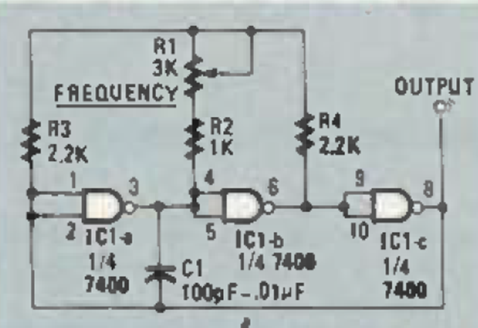 This adjustable frequency circuit was found in December 1986, Radio Electronics magazine. The base frequency is given by C1 and the power supply must be 5 V.