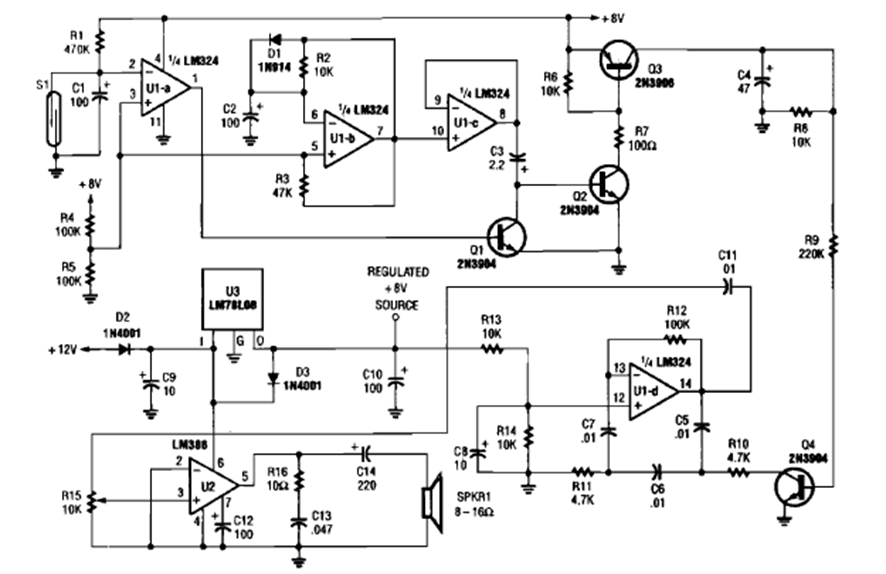This alarm goes off if someone leaves a door open. We found it in the Encyclopedia of Electronic Circuits Volume 5 from 1995. The circuit uses components that are still common today.