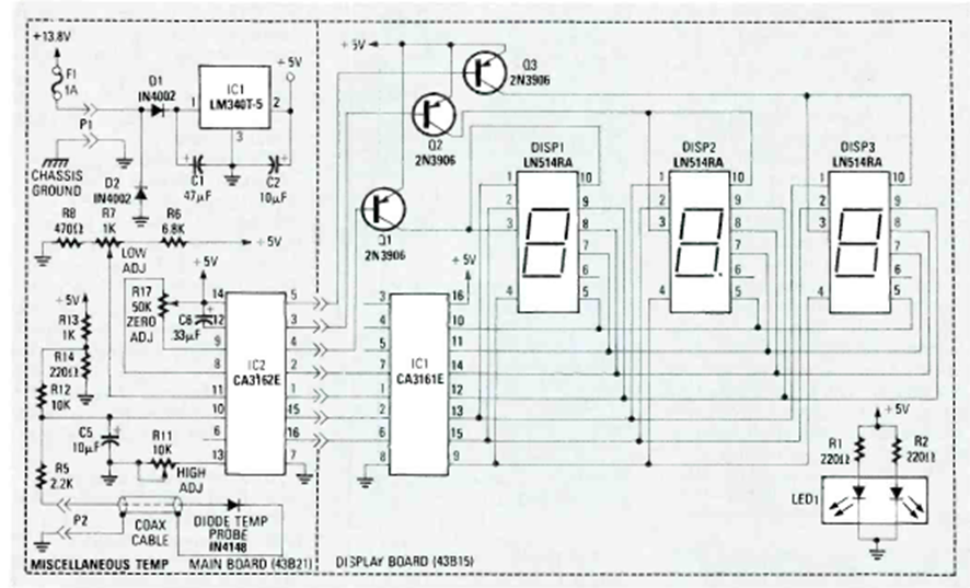 This circuit measures the temperature through the voltage drop across a diode. The circuit was found in the magazine Radio Electronics Experimenter from 1992. The circuit is digital with 2 digits.