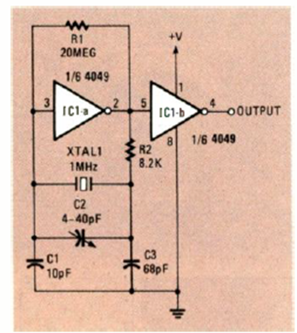 This circuit is from Radio Electronics from February 1987. The frequency is given by the crystal that can be changed. The power supply is between 3 and 12 V depending on the purpose of the circuit.