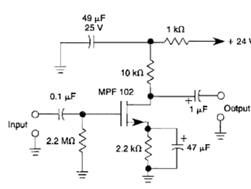 This general-purpose amplifier stage was found in the 1995 Encyclopedia of Electronic Circuits Volume 5. Any JFET can be used and the passband is 100 kHz with 20 dB of gain.