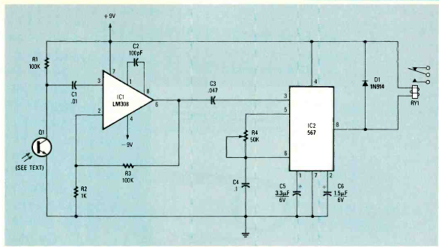 This is the receiver circuit for the previous remote control published in the same Radio Electronics magazine of November 1987. The sensor is a common phototransistor.