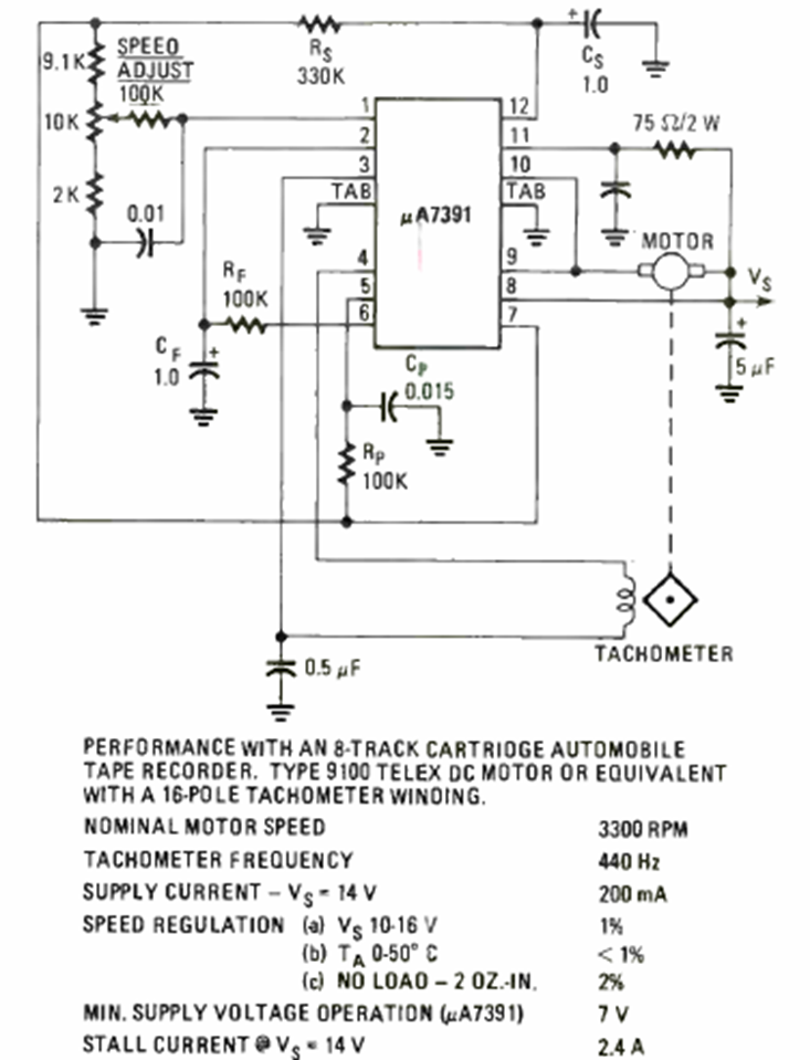 This motor speed control with tachometer sensor was found in the 1993 Radio Experimenter Special Projects. The maximum current is 2.4 A.