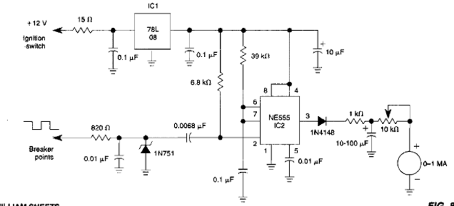 This analog instrument circuit was found in a 1990s William Sheets. The components are common and are only suitable for cars with mechanical switching (platinum).
