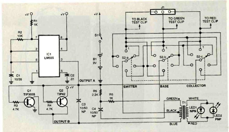 This circuit is designed to identify transistor terminals by means of a selector switch that will be activated until the correct combination of terminals is found. The circuit is from an Electronics Now from February 1999.