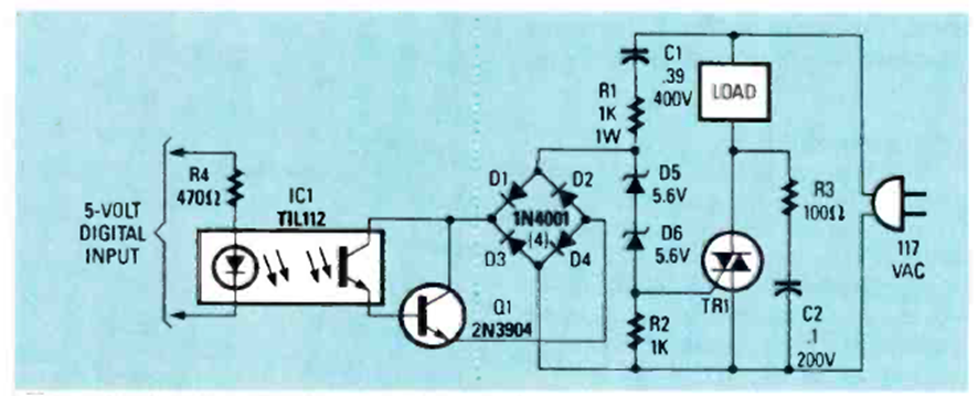 This circuit is an excellent shield for microcontrollers and was found in the October 1987 Radio Electronics magazine. It can be used with other voltages, depending on the triac and the opto-isolator, and supports more modern versions.