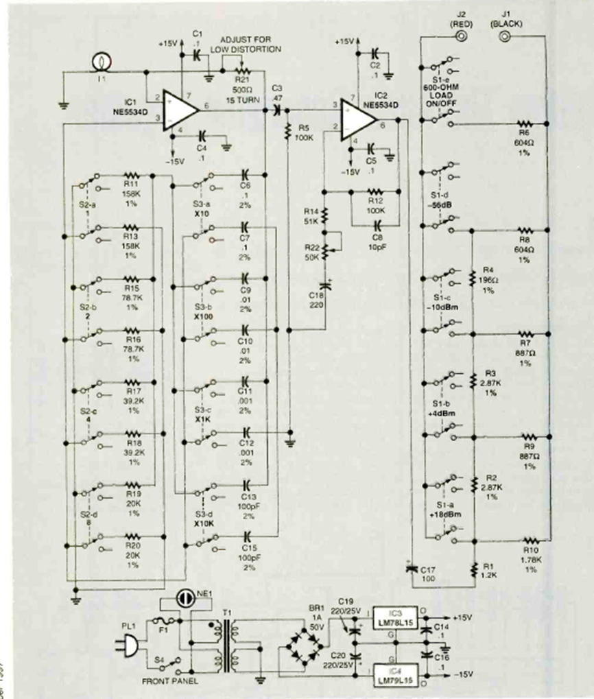 This circuit was found in the September 1997 issue of Electronics Now magazine. The circuit uses two op-amps and includes the symmetrical power supply.