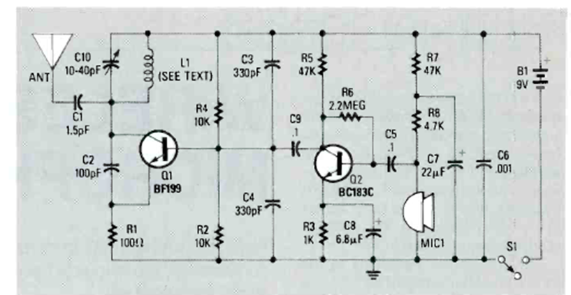 This two-transistor circuit was found in the 1990 special issue of Radio Electronics Experimenter magazine. The short-range circuit has 4 turns of 28 or 30 Ω unshaped wire with a diameter of 0.5 cm at L1. Trimmers values close to those indicated will work.