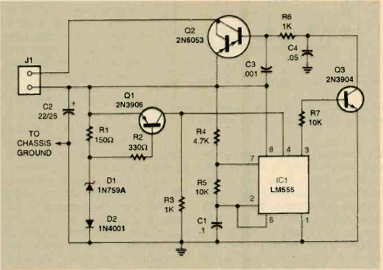 This circuit is used to turn on the headlights when it gets dark. The circuit is from an Electronics Now magazine from October 1998. The power transistor must be equipped with a heatsink.
