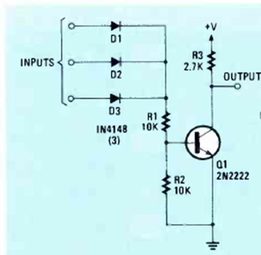 The figure shows how to implement a NOR gate with 3 inputs with common diodes and a common transistor. The circuit has a 5 V power supply to be compatible with TTL logic.