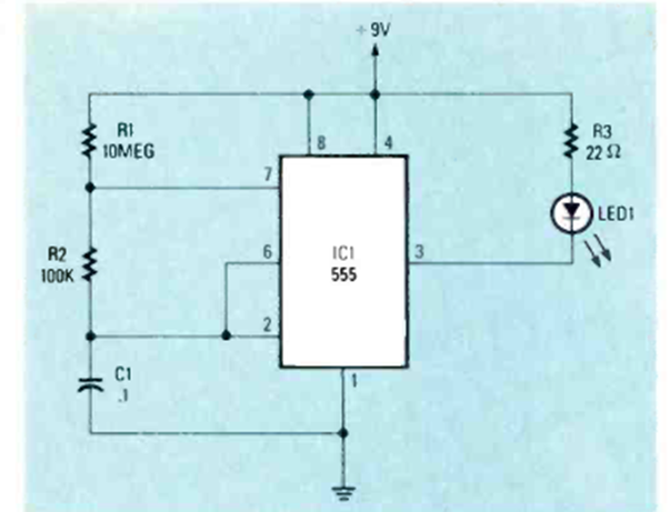This simple switch appeared in an article to be made with SMD components. The magazine is Radio Electronics from November 1987. The circuit can operate with other voltages according to the LED and the application.