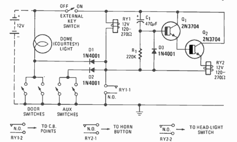 This immobilizer circuit for the car was found in the Radio Electronics magazine of December 1976. It has several sensors blocking the ignition system.
