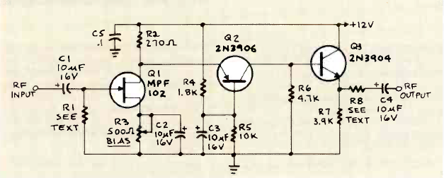 This circuit for RF signals was found in the March 1987 issue of Radio Electronics magazine. The transistors are general purpose for frequencies up to 3MHz. The circuit has a gain of approximately 30 dB.