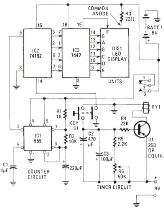 This circuit with common components was found in the Electronics Experimenter Special projects of 1983. The circuit has a countdown timer and drives a relay.