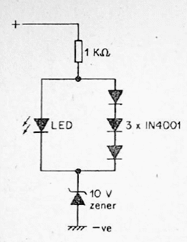 This circuit is a variation of the previous one, indicating a voltage range, for example 11.5 to 12.2 V for a red LED and a 10 V zener. The circuit is from an old English documentation.