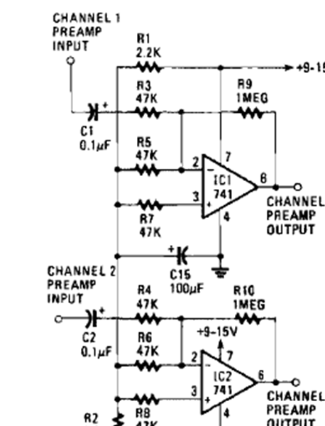 We found this circuit in a Radio Experimenter Handbook from the 90s. The circuit uses 741 op amps and has good gain without a dual power supply.