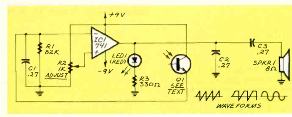 This small tone generator was found in the November 1987 issue of Radio Electronics magazine. The phototransistor is common and controls the sounds generated. The basic frequency is given by C1.