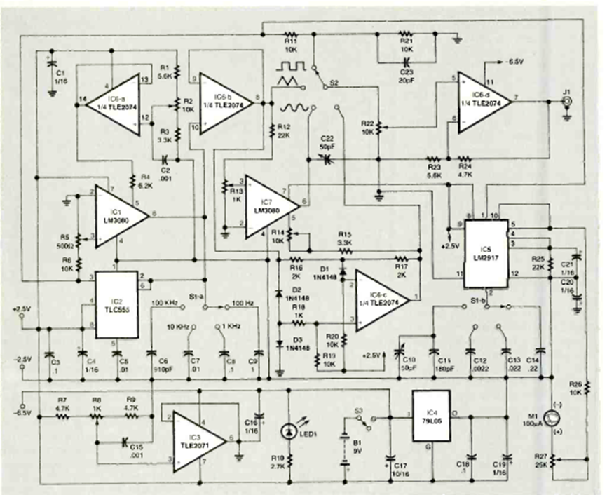 This circuit was found in the August 1997 Electronics Now magazine. The circuit uses well-known operational codes and generates signals up to 20 kHz.