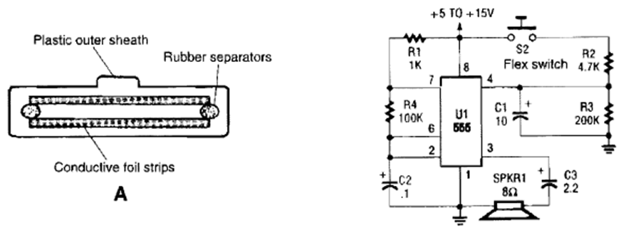 This circuit with pressure sensor was obtained from the Encyclopedia of Electronic Circuits volume 5 of 1995. Note the construction of the sensor with rubber and conductors.