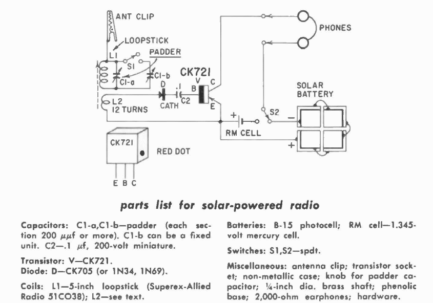 This primitive solar radio was found in a Gernsback publication from 1960. The transistor is made of germanium of the time and the earphone is magnetic with high impedance.