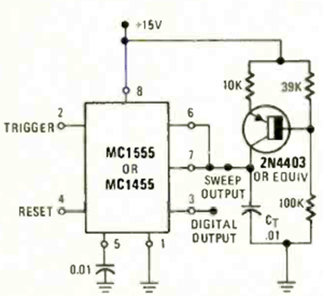 We have other similar setups on this site. This one is from September 1976 Radio Electronics. The circuit uses a constant current source to charge the timing capacitor.