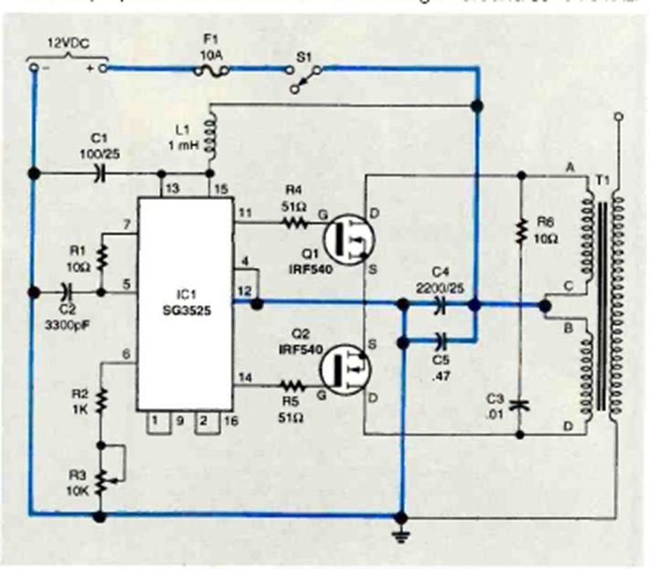 This circuit was found in the August 1997 Electronics Now magazine. The FETs must be provided with heat sinks.