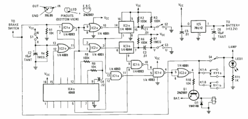 This sophisticated circuit for the 90s car was found in the 1993 edition of Radio Electronics Special Projects. It uses components that are still common today.