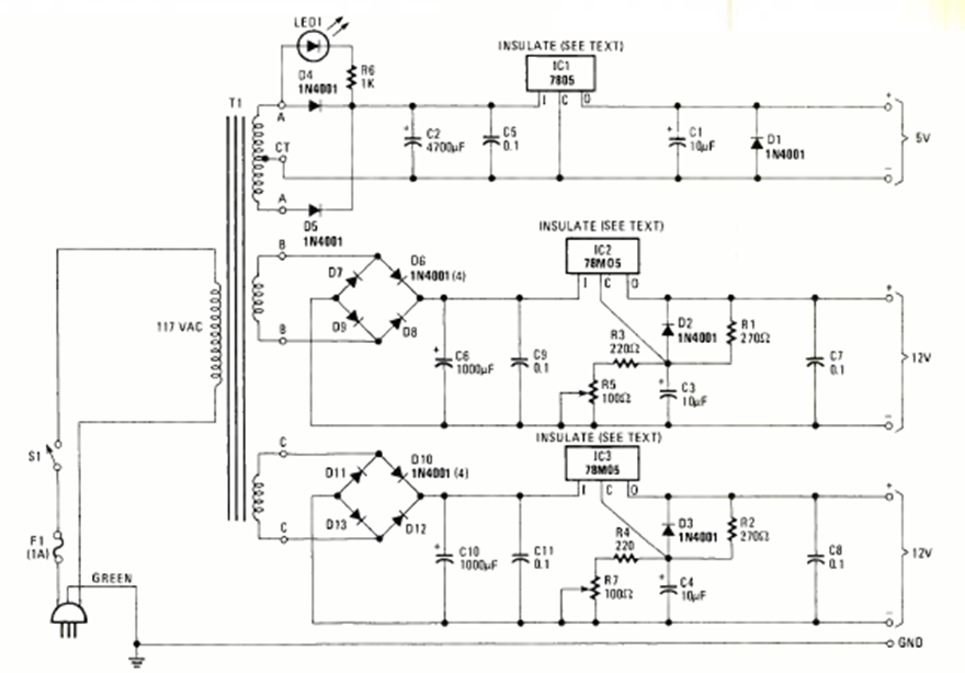 This benchtop power supply has 3 voltage outputs that can be used simultaneously. It can be found in the 1983 Special Projects section of the Electronics Experimenter's Handbook. Integrated circuits must be equipped with heat sinks.