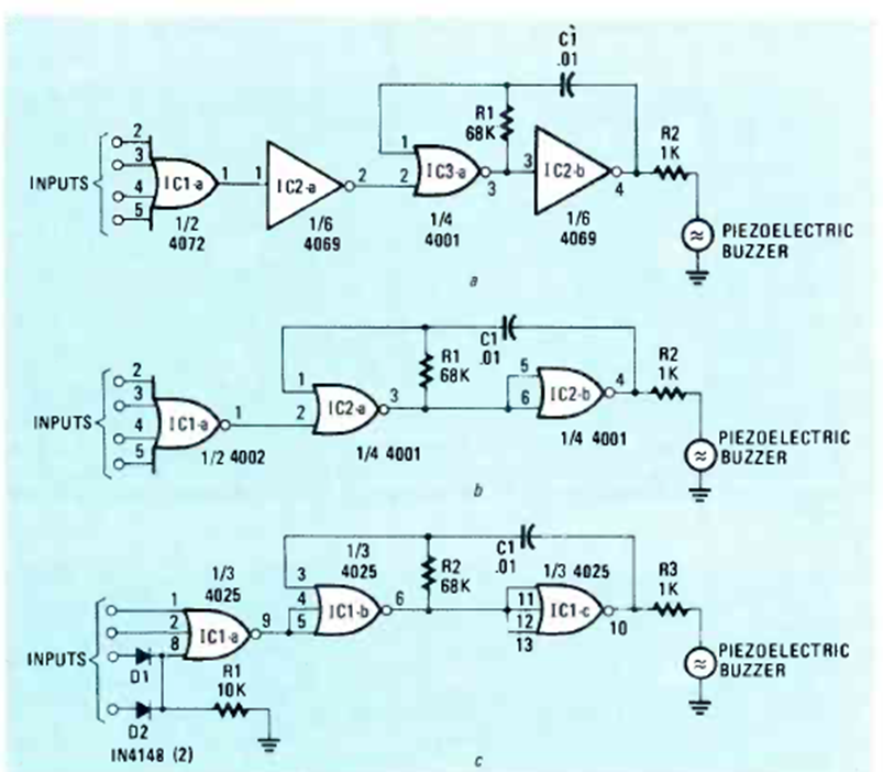 In the figure we have 3 oscillators with logic gates that can be triggered by external logic signals. The circuits were found in the Radio Electronics magazine of April 1987.