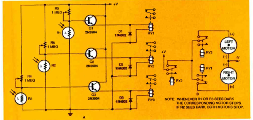 We found this circuit in the October 1996 Electronics Now magazine. The circuit uses LDRs as sensors and drives relays. The relays must have voltages according to the power supply.
