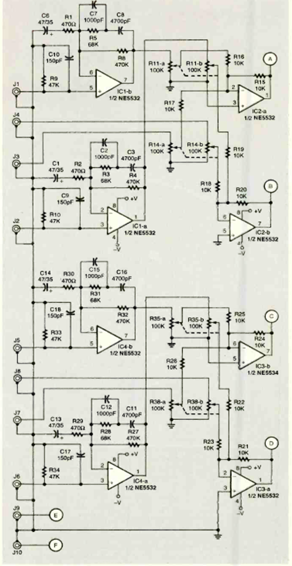 We found this 4-channel mixer in the August 1999 issue of Electronics Now magazine. The circuit can be expanded to more channels and requires a symmetrical power supply.