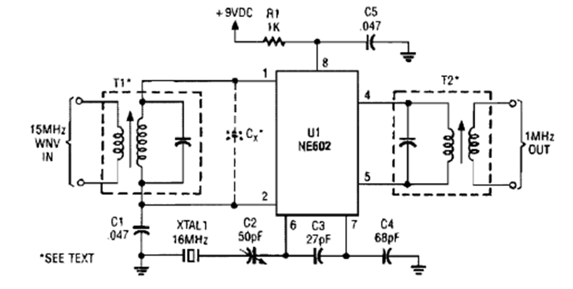 This converter for WWV time reference station signals was found at Popular Electronics. The 15 MHz signals are now received on a medium wave radio at 1 MHz.