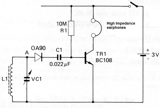This simple circuit for a high impedance magnetic phone (500 ohms or more) has been found in a Spanish documentation of 1983. The circuit can be powered by 1 to 4 small cells and the coil consists of 80 to 100 turns of enamelled wire 28 to 32 in a Ferrite rod. It is recommended to use a long antenna. The transistor may be the BC548.