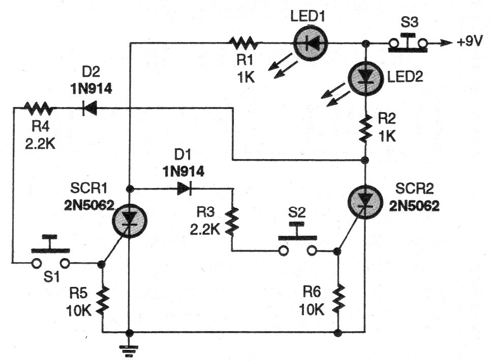 This well-crafted speed game setup for two competitors was found in a 1998 Poptronics. The circuit can be powered with either 9 or 12 V voltages. The SCR can be the TIC106 and the reset is done by pressing S3 for a moment.