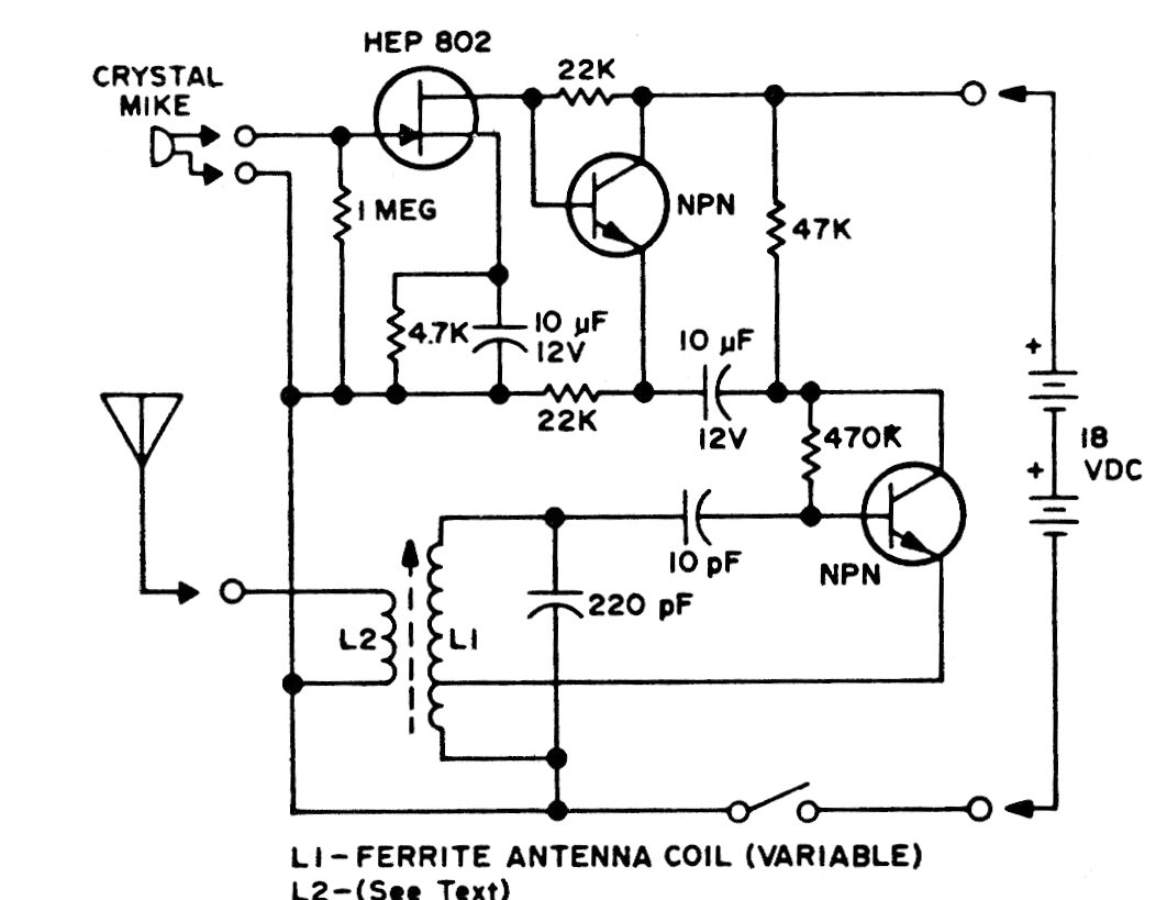 This small-range MW transmitter can be used as a wireless microphone. The circuit is from an American documentation of the 1980's. The coils are of the ferrite type for medium waves and the microphone used must be of the crystal type. L2 consists of 4 turns of wire on L1.