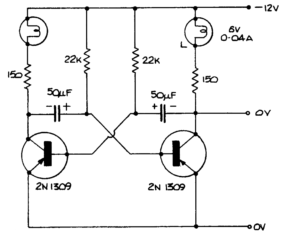 This alternating flasher was found in a 1980s documentation. The transistors may be equivalent such as the BC558 and LEDs may be used instead of lamps. The capacitors can have values between 10 and 100 uF according to the desired frequency.