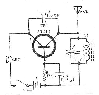 The microphone of this short-range MW transmitter should be low impedance magnetic (a small speaker) or charcoal. L1 is formed of 80 loops of yarn 28 on a ferrite rod and CV is a former AM radio variable. The transistor may be the BC558 and the 40 cm to 1.5 m long telescopic antenna. The frequency range is between 500 and 1600 kHz.