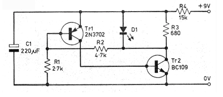 This circuit was obtained from a 1978 Practical Wireless. It causes an LED to flash at a frequency that depends on capacitor C1. The PNP transistor can be a BC558 and NPN a BC548 or BC549. The LED is any color.