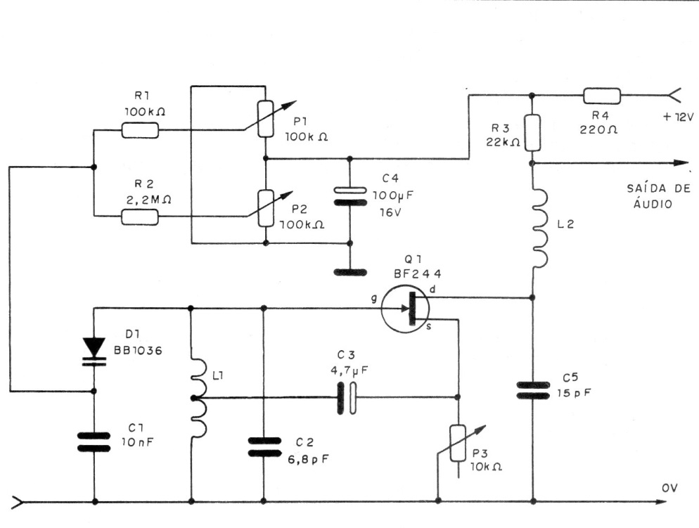 This circuit is from a 1992 publication, but can be mounted very easily today. The circuit is powered by 9 V battery or 12 V source and has very low power consumption. Its output is connected to the input of a good audio amplifier. The tuning is done in two potentiometers and L1 consists of 4 1 cm-shaped loops22 with central socket. L2 consists of 20 turns 28 of wire in a 100 k resistor at 1 M x ½ W.