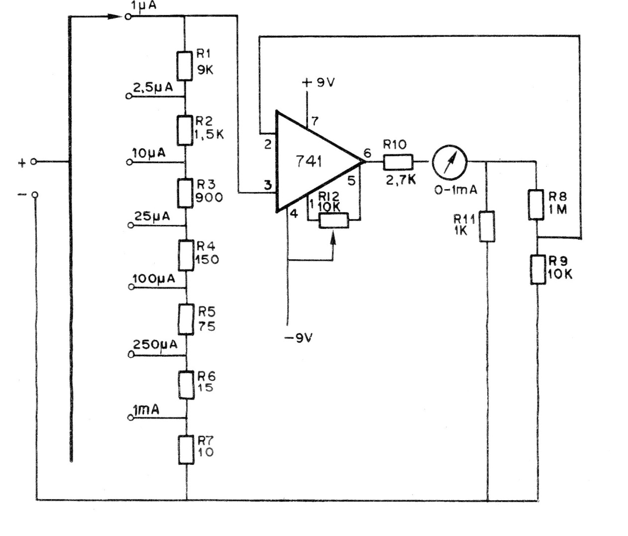 This traditional circuit of old documentation uses a 0-1 mA milliammeter and has several scales. The symmetrical power supply is made up of two 9 V batteries. Potentiometer or trimpot R12 serves as a zero adjustment for the operational. The accuracy of the instrument depends on the accuracy of the resistors.