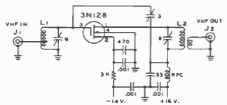 This MOSFET amplifier operating in the VHF range was found in an old American telecommunications documentation. The tuned circuits are for the operating frequency.