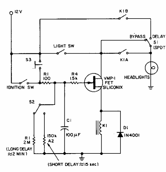 Found in an Electronic Design this circuit controls a headlamp by triggering a time determined by the selection of two resistors. The circuit is powered by the car battery.