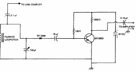 This receiver can be used to receive signals from the previous circuit transmitter. The circuit is from an 80's American documentation. The transistor admits equivalent as the BC558. The coil is according to the frequency of the transmitted signal.