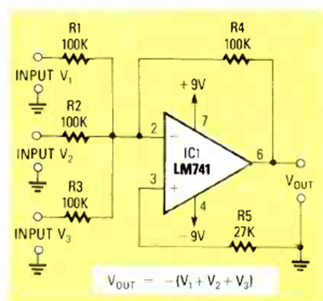 This circuit was found in the May 1989 issue of Radio Electronics magazine. The circuit requires a symmetrical power supply. More inputs can be added.