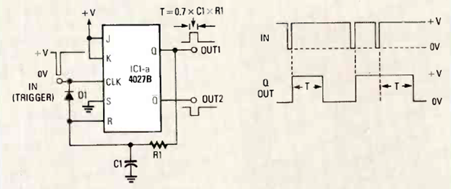 This circuit is from an April 1988 Radio Electronics magazine. The circuit is retriggerable and has complementary outputs.