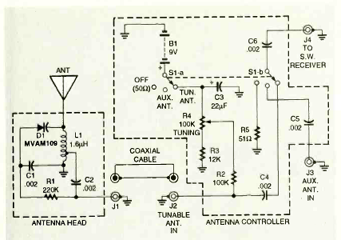 This shortwave preselector was found in the July 1994 issue of Radio Electronics magazine. The circuit is suitable for telescopic antennas, matching the impedance with the receiver used.